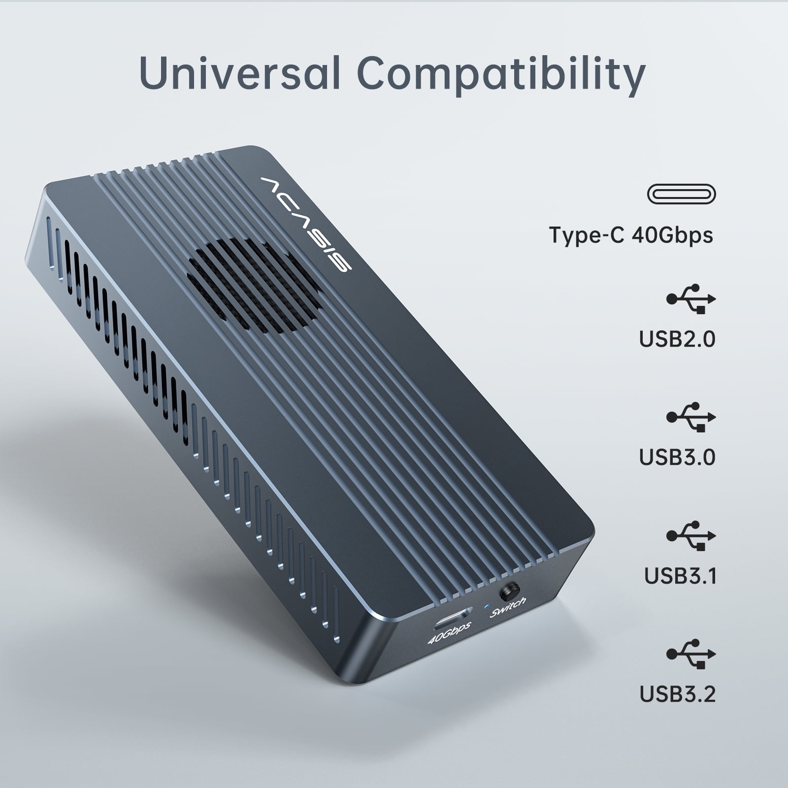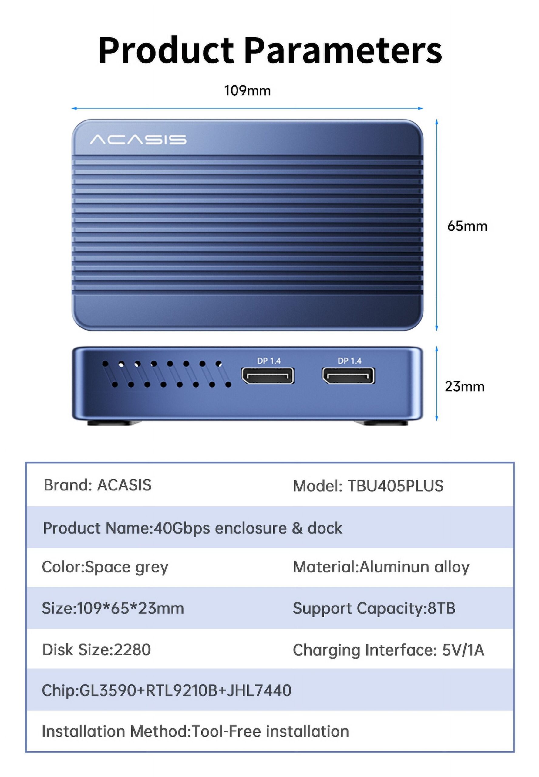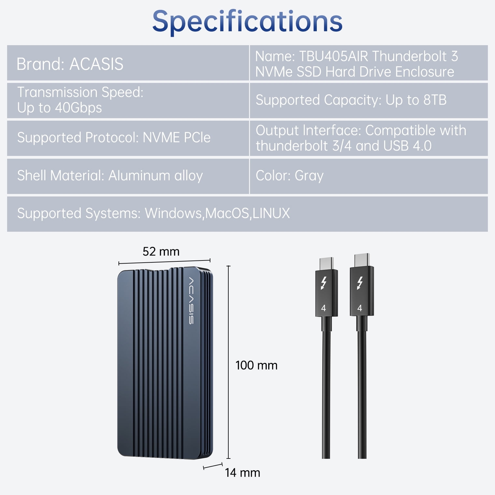 ACASIS 40Gbps M.2 SSD Enclosure, compatible with USB4.0, supports 8TB. This powerful ACASIS external HDD enclosure supports 2280 size NVME M.2 SSDs and 8TB large capacity SSDs for inventory expansion. It features a interface with up to 40Gbps high-speed transmission for efficient work processing. The aluminum alloy case and built-in heat dissipation silicone ensure faster heat dissipation and better SSD protection. Compact and portable, it requires no driver installation, plug and play. Compatible with Windows 7/8/10/11, Mac OS 10.3 or above, LINUX.
