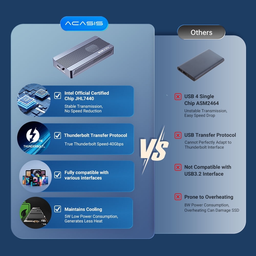 • Rugged, Silent & Reliable: The ACASIS SSD enclosure features a solid, fanless aluminum body with a curved surface. The design ensures effective passive cooling and exceptional durability. Enjoy completely silent operation and reliable data protection in any environment. This 40Gbps M.2 NVMe SSD enclosure comes with a two-year quality assurance. For warranty terms and detailed information, please refer to the product manual.