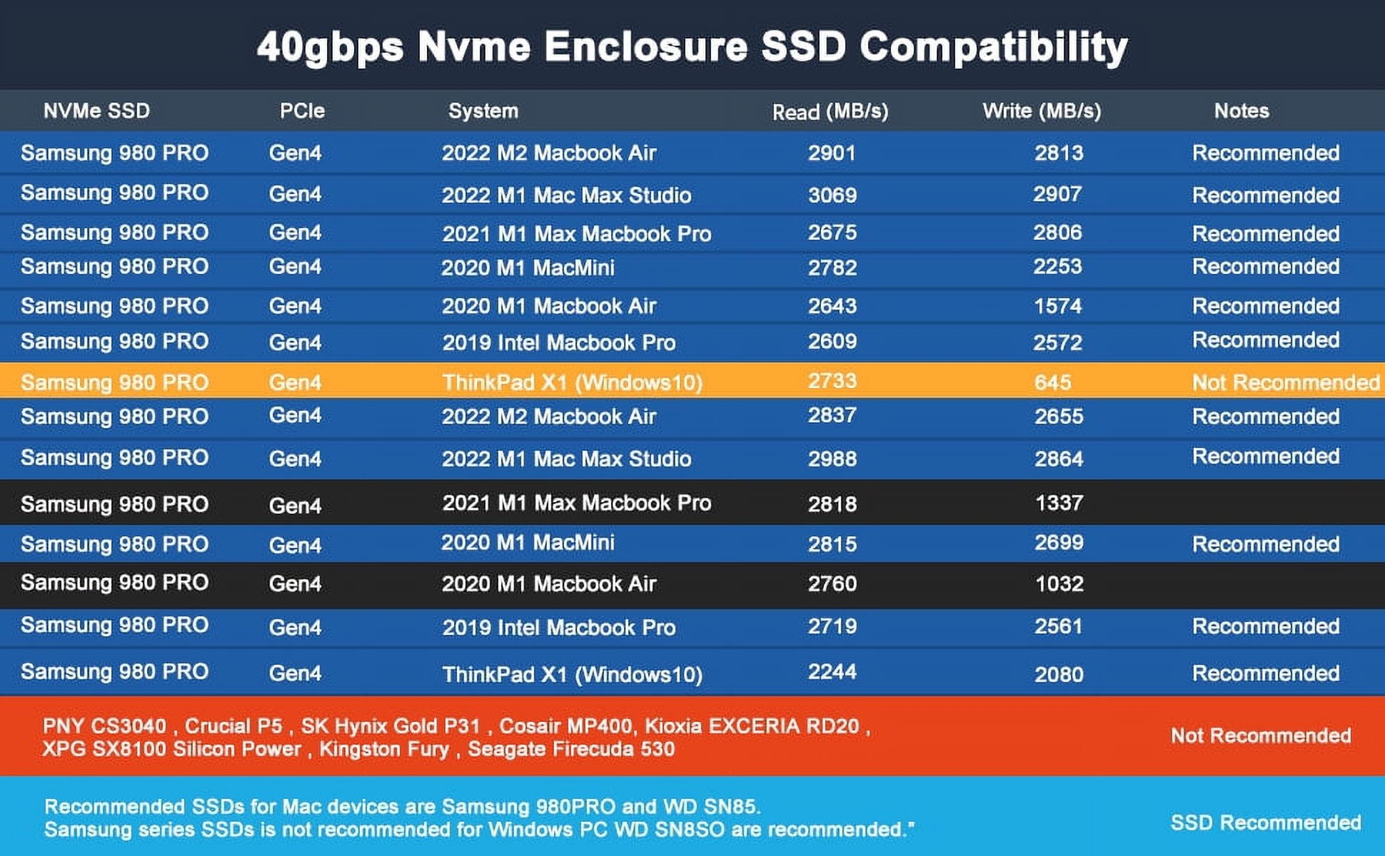 At the price point of $45 this works very well, I added a 2tb SSD NVME and I get speeds in an external drive as fast as my internal drive on my Mac Mini M4. You must use the ; 40GPS port on the computer by a great way to expand your computers memory with out paying Apples insane pricing.